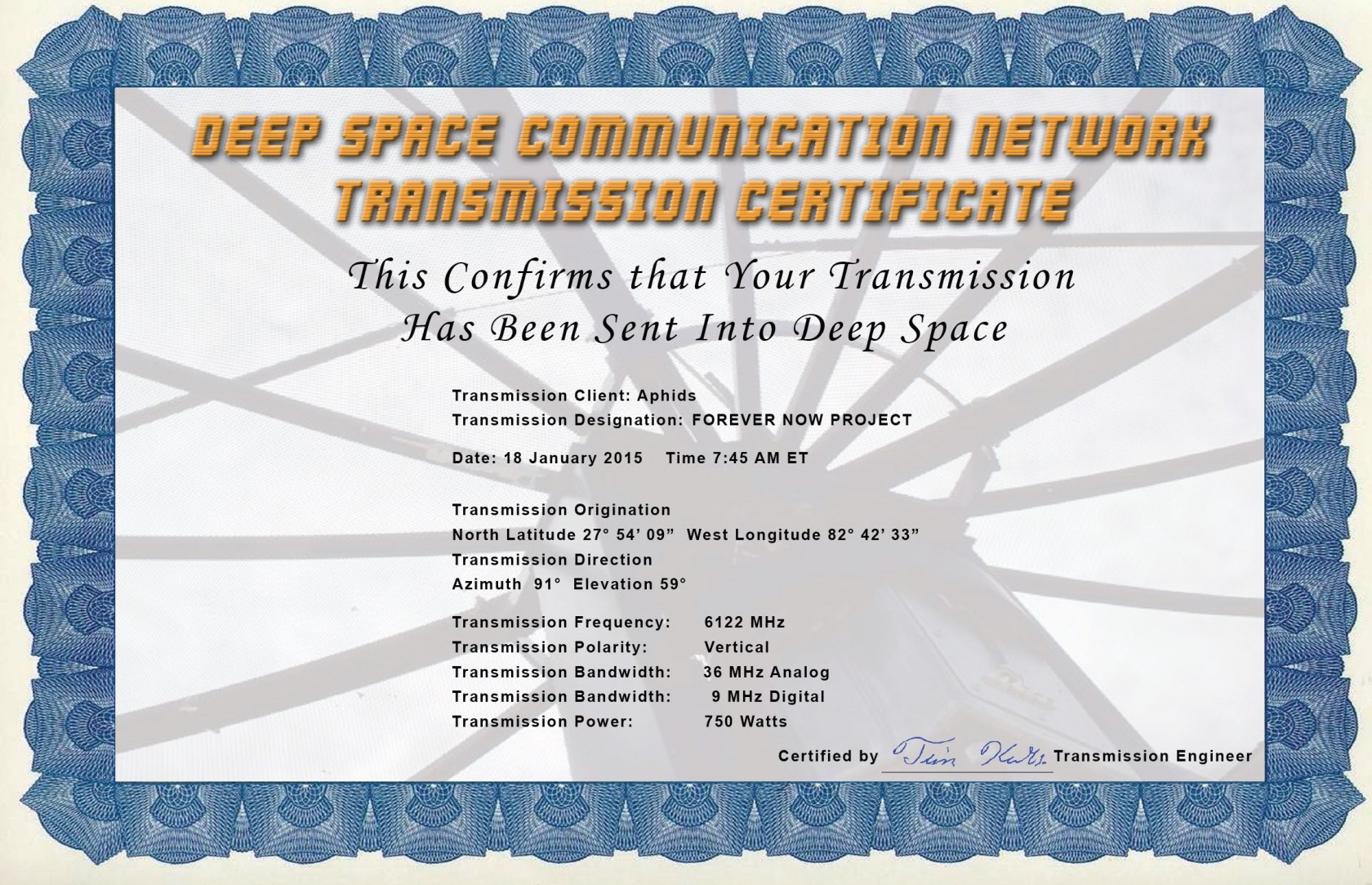 The 44 selected works will be launched into space as part of a spectacular concert in January 2015. Working with the Deep Space Communications Team, a private company who transmit inter-stellar messages, at this launch we will digitally broadcast the record’s content and the location of the three physical objects into space.