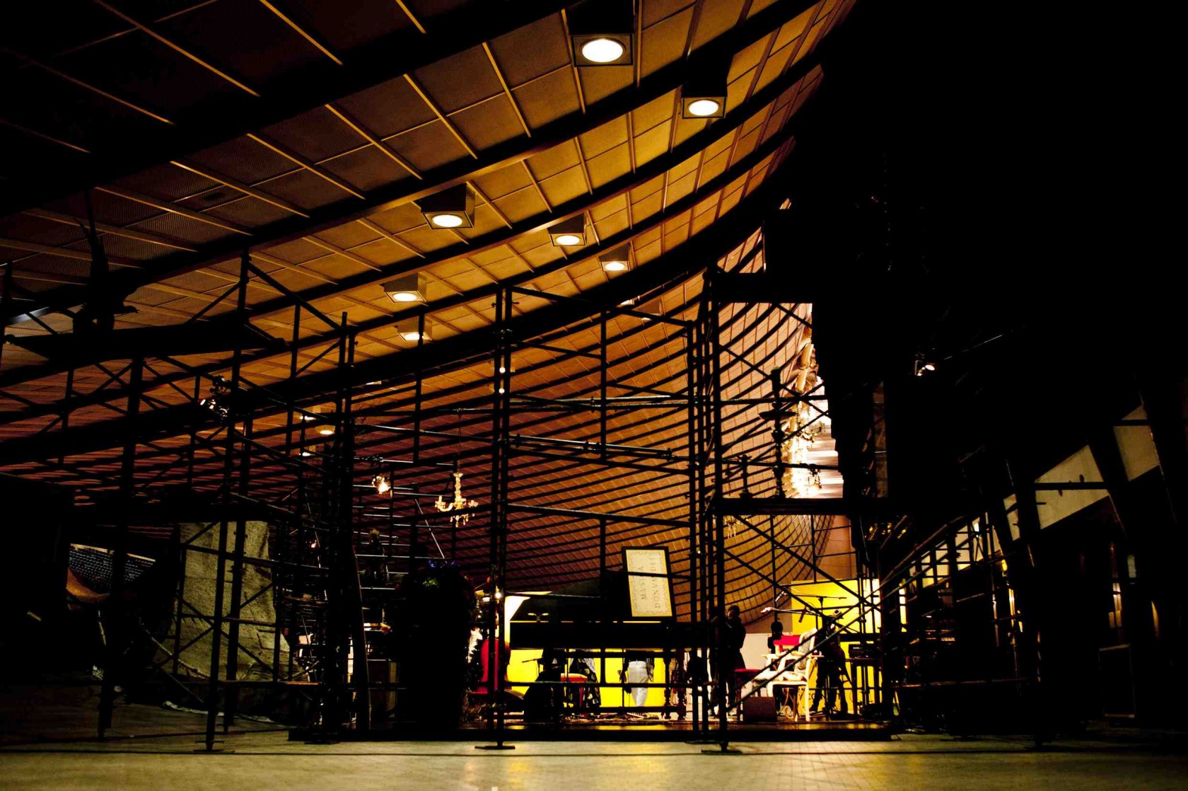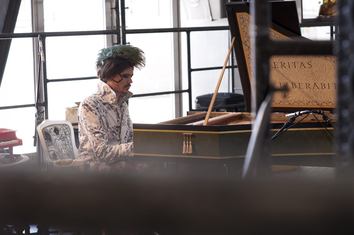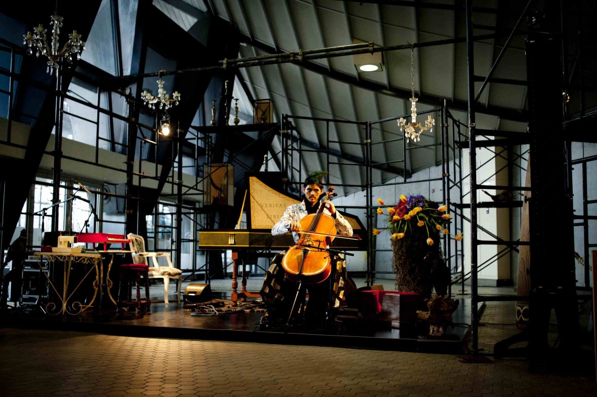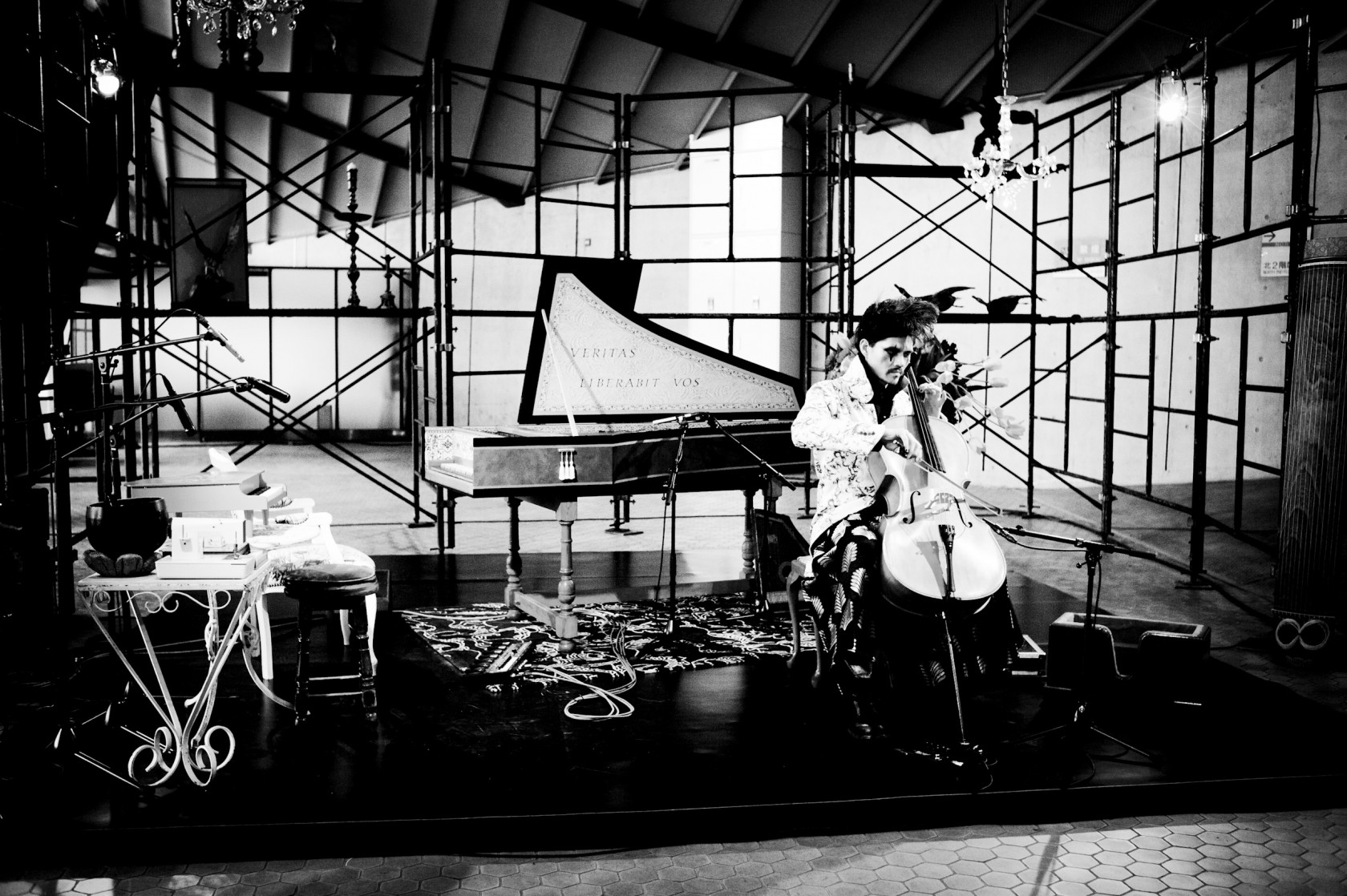 A 200m2 structure of recycled metal scaffolding was erected to create a spatial skeleton, a performance installation space and stage, removing the walls or “barriers” of a museum or traditional music venue. The intent of this open space installation being to invite the audience to interact and engage with the artist and the artists’ space, challenging notions of the separation between audience and artist.